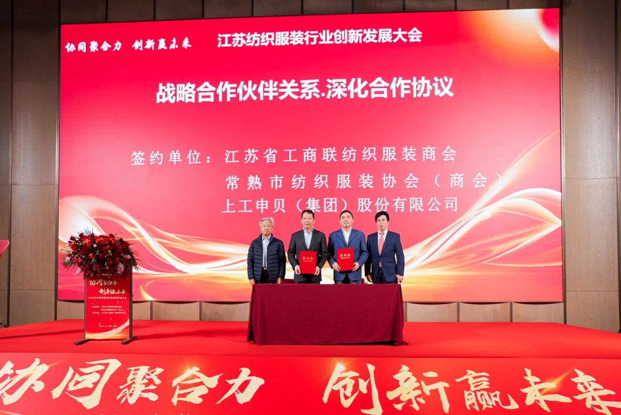 1月18日下午,江苏纺织服装行业创新发展大会在常熟昆承湖凯悦酒店隆重召开。本次大会以“协同聚合力 创新赢未来”为主题,汇聚行业领导、专家学者及企业代表近300人出席会议,共同探讨纺织服装行业转型升级与高质量发展路径。